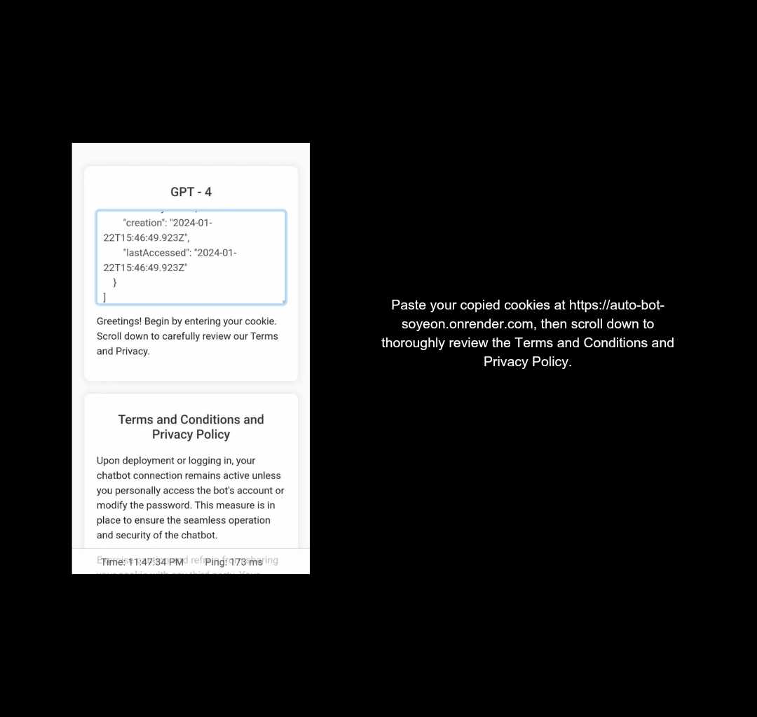 11. Paste your copied cookies at https://auto-bot-soyeon.onrender.com, then scroll down to thoroughly review the Terms and Conditions and Privacy Policy.