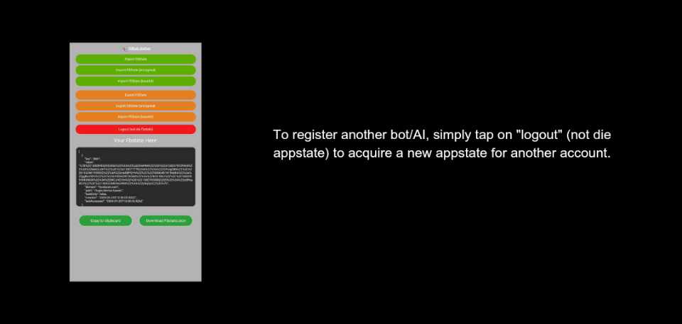 To register another bot/Al, simply tap on "logout" (not die appstate) to acquire a new appstate for another account.