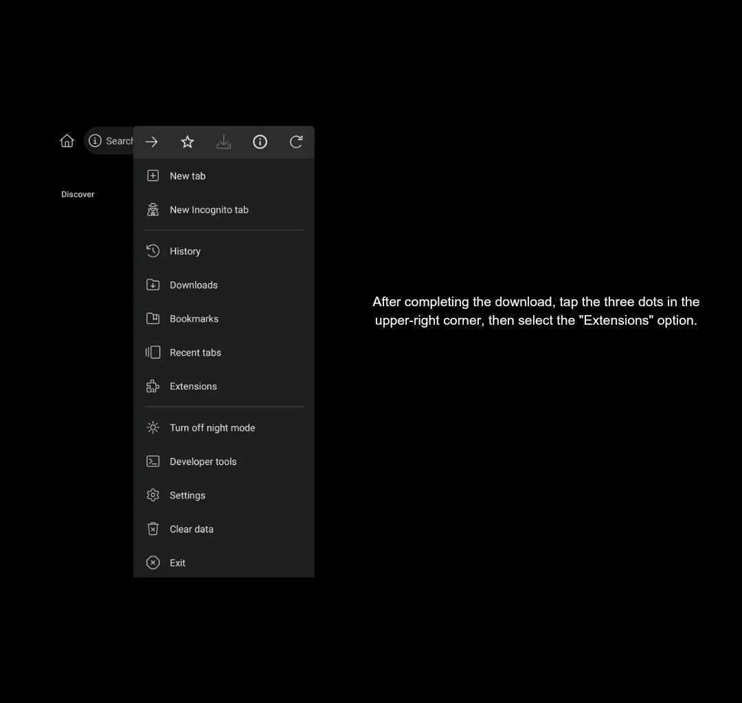 4. After completing the download, tap the three dots in the upper-right corner, then select the "Extensions" option.