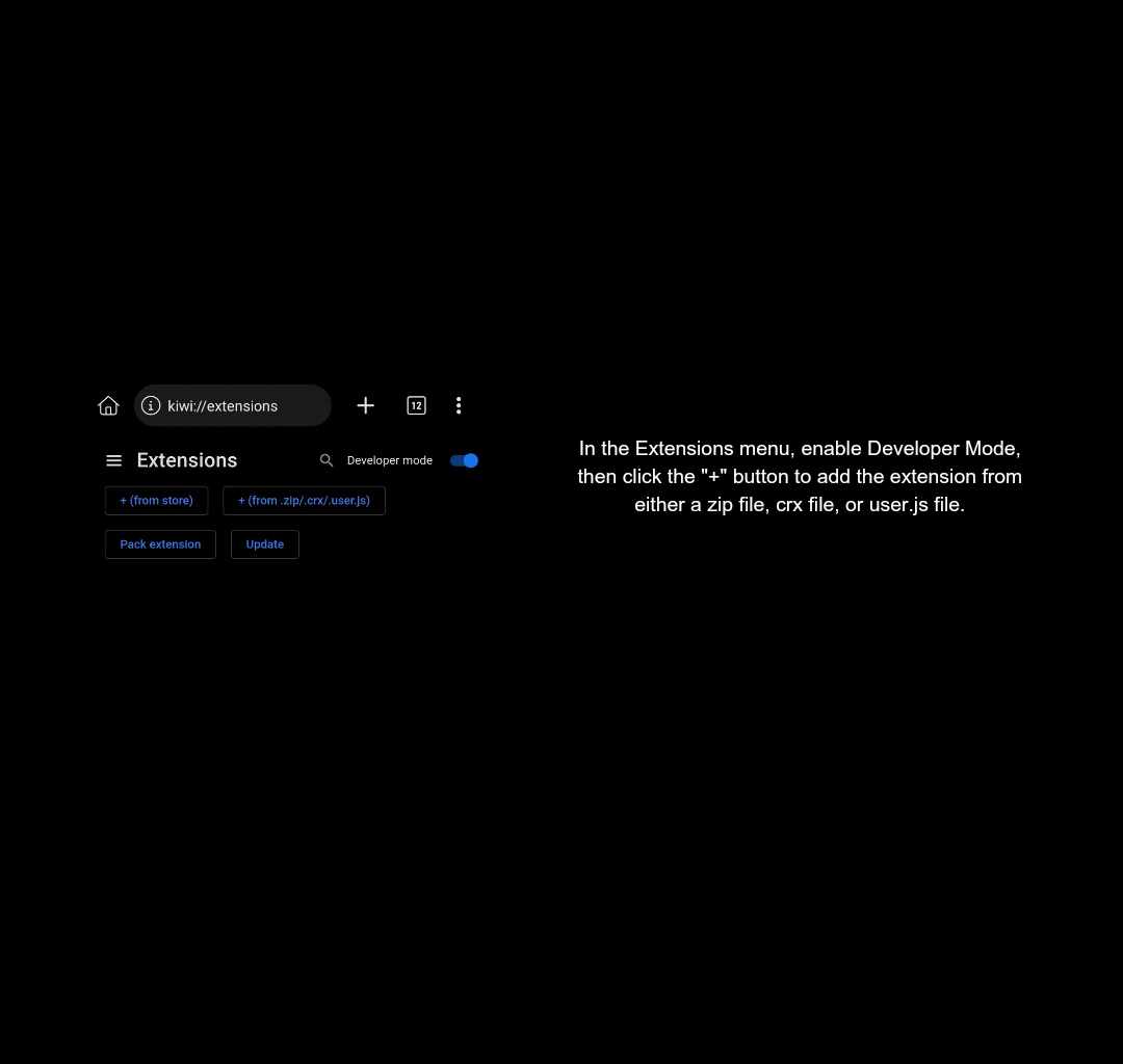 5. In the Extensions menu, enable Developer Mode, then click the "+" button to add the extension from either a zip file, crx file, or user.js file.