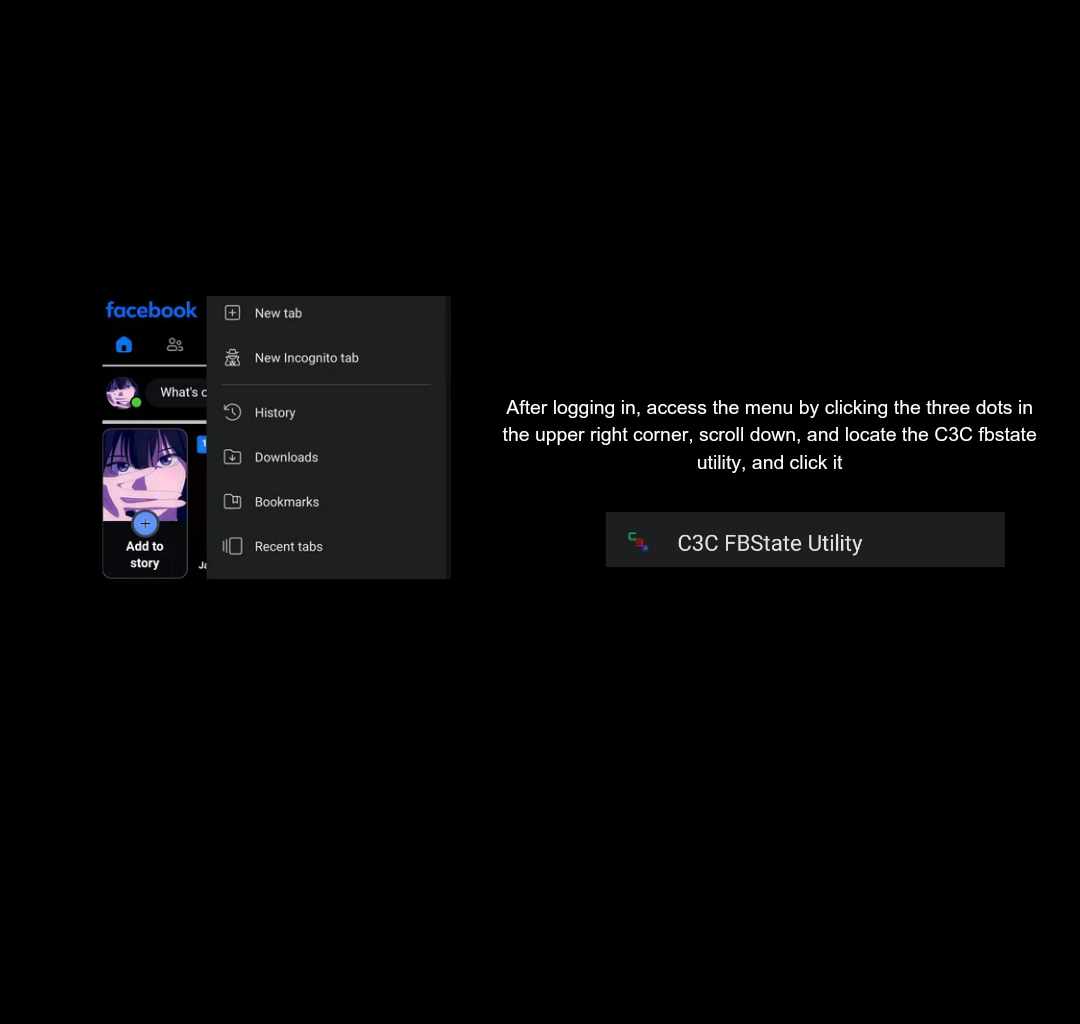 9. After logging in, access the menu by clicking the three dots in the upper right corner, scroll down, and locate the C3C fbstate utility.
